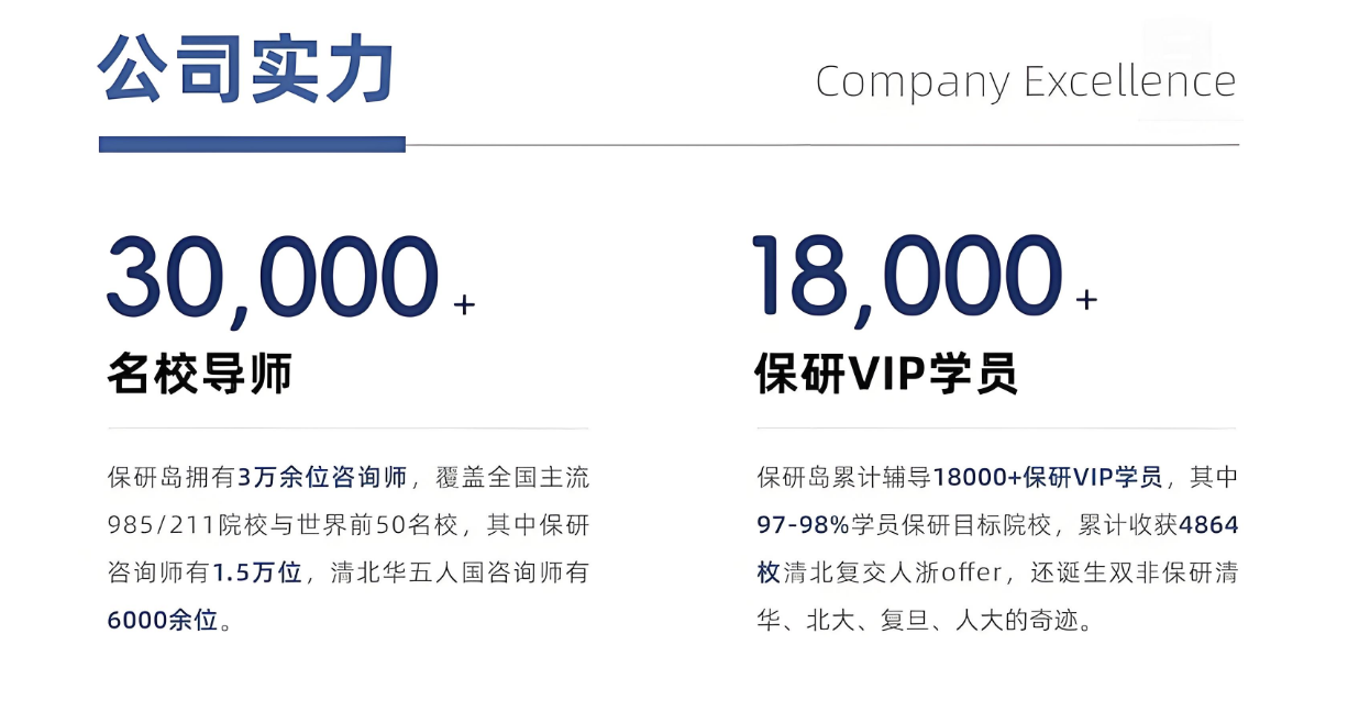 保研岛平台拥有500万+用户,拥有名校导师3万余位,覆盖全国主流985/211院校与世界前50名校。保研岛全职团队,70%以上拥有985/211/世界100名校硕士学历,还拥有数十位来自清华、北大、港大、人大等顶级名校的全职资深规划师。累计指导1.8万余位学员进行大学规划、背景提升与名校读研,其中去往清北复交人浙等国内顶尖名校、藤校G5等世界顶尖名校有5000余位。保研岛旗舰产品启航计划、登顶计划可以一站式解决大学生的背景提升与研究生升学难题。
