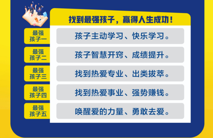 我们独创的《最强孩子》人性课、《个性与专业就业选择》、《就业的人性技巧》、《真爱之旅》、《重启赚钱的天赋》,帮助不同人生阶段的孩子,运用人性智慧追求属于自己的学业成功、事业成功和婚姻成功。