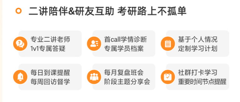 教学服务:高途考研还为考研学子配备二讲老师及班主任老师。 二讲老师陪伴学生学习的全程,从课前预习、课堂互动到课后辅导、作业批改对学生进行全程答疑、 伴学,充分保障学生的学习、备考效果。解决学生课后的个性化问题,掌握每一位学生的学习状况, 为考研之路再加一重保险。 班主任老师全程管家式伴学,课前课中课后跟踪学习状态,随时监督学生的学习情况,全程心理疏 导,高三式学习氛围,帮助学员养成良好学习习惯,保证学习效果。