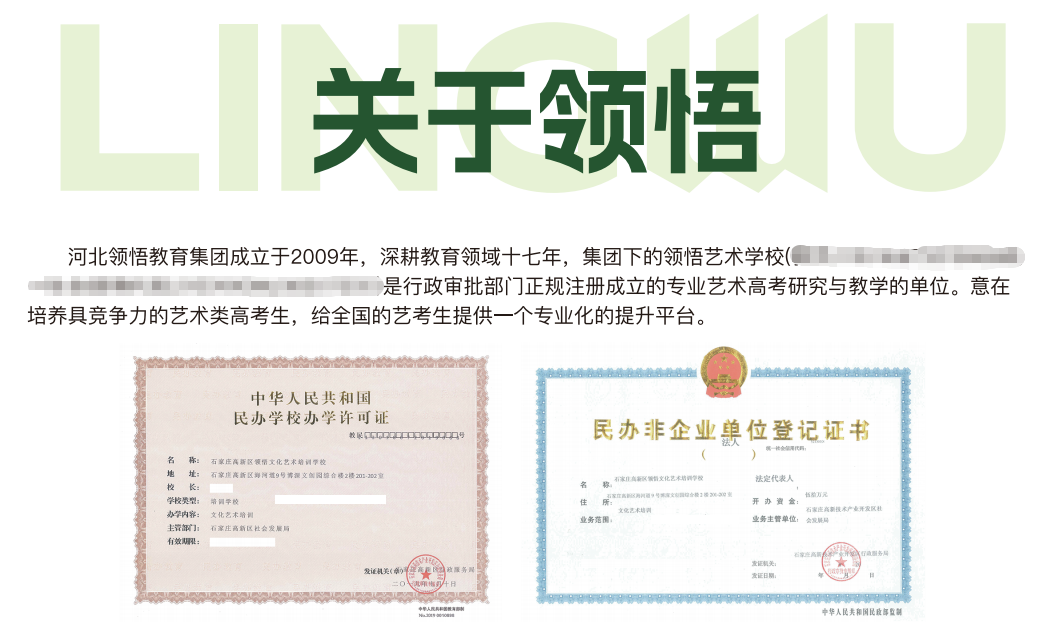 河北领悟教育集团成立于2009年,深耕教育领域十七年,集团下的领悟艺术学校是行政审批部门正规注册成立的专业艺术高考研究与教学的单位。意在培养具竞争力的艺术类高考生,给全国的艺考生提供一个专业化的提升平台。